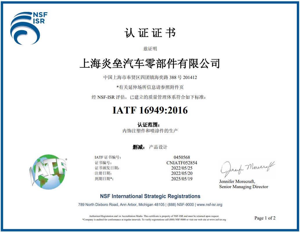 2019年5月份獲得了ITAF/TS 16949質(zhì)量管理體系認證證書。